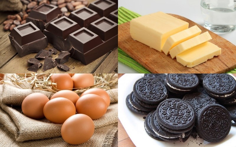 Thái nhỏ socola. Đánh tan 2 lòng đỏ trứng gà với đường, lọc kỹ qua rây cho trứng mịn. Sau đó chia làm 2 phần. Cho socola và bơ vào bát. Đun cách thủy trên 1 nồi nước sôi lăn tăn, vừa đun vừa đánh cho socola và bơ tan chảy hoàn hoàn. Khi socola và bơ đã tan chảy hết, tiếp tục cho kem tươi vào, đảo đều đến khi kem tươi hòa tan hết. Sau đó tiếp tục cho lần lượt từng phần lòng đỏ trứng đã chia vào, đảo đều thành một hỗn hợp có màu nâu đen (gọi là terrine). Bật lò nướng, làm nóng lò ở nhiệt độ 160 độ C ở chế độ 2 lửa (trên và dưới). Đợi cho lò nóng khoảng 15 phút. Đổ hỗn hợp vào khuôn nướng có lót sẵn giấy nến rồi đặt khuôn vào khay nướng có lót sẵn 1 chiếc khăn mỏng. Kế đến, cho nước sôi vào ngập đến 1/2 khuôn. Nướng cách thủy ở nhiệt độ 160 độ C trong 25 phút. Sau khi nướng xong, chờ cho hỗn hợp nguội rồi đặt vào tủ lạnh khoảng 3 - 4 tiếng cho hỗn hợp đông cứng lại. Khi hỗn hợp đã đông lại thì tách ra khỏi khuôn, bóc bỏ lớp giấy nến. Cắt 4 cạnh xung quanh, mỗi cạnh dày khoảng 0,5 - 0,7cm.