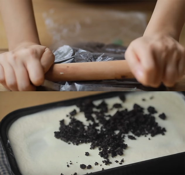 Mách nhỏ: Bạn cũng có thể dùng đáy ly thủy tinh để ép nhẹ phần bánh oreo cũng được nhé!