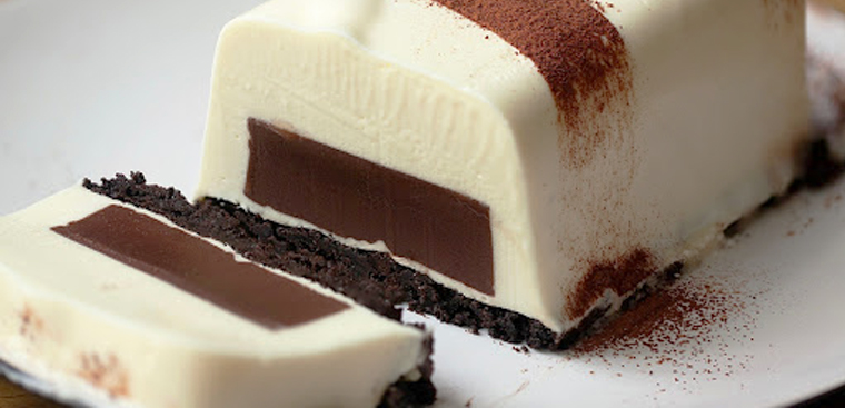 Ngâm lá gelatin với 15 ml nước lạnh khoảng 10 phút cho gelatin nở mềm. Sau đó mang gelatin đi quay lò vi sóng hoặc đun cách thủy 15 - 20 giây đến khi gelatin tan chảy hoàn toàn. Sữa chua không đường để ở nhiệt độ phòng, trộn đều với đường. Khi đường đã tan, cho từ từ gelatin vào, vừa cho vừa khuấy đều. Đánh kem tươi đến khi bông mềm (khi nhấc phơi đánh lên, thấy kem mịn, chóp kem cong xuống là được) , rồi cho từ từ hỗn hợp sữa chua vào, trộn đến khi hòa quyện thì dừng lại rồi chia hỗn hợp thành 2 phần. Kế tiếp, đổ 1/2 hỗn hợp vào khuôn (dùng khuôn đựng hỗn hợp terrine ban nảy), đổ đến 2/3 khuôn rồi cho vào ngăn đá tủ lạnh khoảng 20 phút cho hỗn hợp mousse đông lại. Trong thời gian này, cần chú ý khuấy liên tục 1/2 hỗn hợp mousse còn lại để không bị đông sệt. Khi hỗn hợp mousse trong khuôn đã đông lại, dàn 1 lớp mỏng mousse còn lại lên trên mặt. Kế đến đặt khối hỗn hợp chocolate terrine lên, dàn tiếp lớp mousse còn lại cho phủ kín khuôn và terrine. Sau đó đặt lại vào ngăn mát tủ lạnh thêm 90 phút nữa cho mousse đông hoàn toàn.