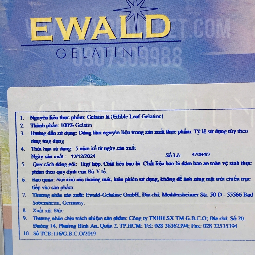 Công dụng: Làm thạch, mousse, pudding, kem lạnh.Chất liệu: Gelatine nguyên chất, an toàn thực phẩm.Đóng gói: Túi 1kg tiện lợi cho tiệm bánh và sản xuất.Bảo quản: Nơi khô ráo, tránh ánh sáng trực tiếp.